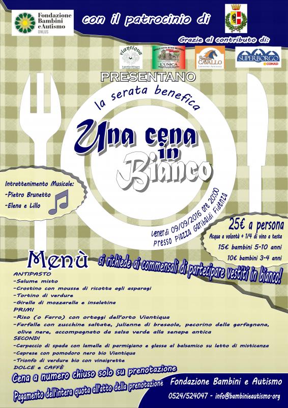 Organizzata dalla Fondazione Bambini e Autismo onlus, con il patrocinio del Comune di Fidenza e il contributo di “Viantiqua” agriturismo e benessere, Spalla cotta di San Secondo Cavalli Emanuele, Panificio Cavallo e Conad Superborgo, la cena si terrà nella splendida cornice di piazza Garibaldi con l'intento di creare un momento conviviale di incontro, diffondere la conoscenza dell'autismo e sensibilizzare l'opinione pubblica su questo disturbo.