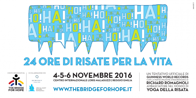 Il 4-5-6 novembre 2016 si svolgerà al Centro Internazionale Loris Malaguzzi di Reggio Emilia il primo grande evento organizzato da The Bridge for Hope: “24 ore di risate per la vita” a sostegno delle persone impattate dal cancro, i loro familiari e delle associazioni che, com noi, li sostengono ogni giorno. Tre giornate dedicate alla sensibilizzazione e all’approfondimento delle cure integrative in campo oncologico. Interverranno relatori nazionali e internazionali, medici e formatori di alto livello che daranno i loro contributi. L’evento sarà accompagnato da un tentativo ufficiale del Guinness World Records grazie alla guida speciale di Richard Romagnoli, Ambasciatore nel Mondo di Yoga della Risata, che guiderà circa 100 Challengers nella sfida.