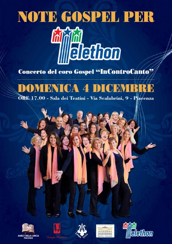 Amici della Lirica di Piacenza, Famiglia Piacentina, Centro Musicale Tampa Lirica e Fondazione Teatri di Piacenza annunciano l'evento benefico 2016 a favore di Telethon: Note Gospel per Telethon, domenica 4 dicembre 2016 ore 17 presso la Sala dei Teatini di Piacenza (Via Scalabrini 9).