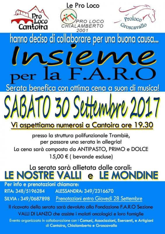 Dopo l'importante evento di solidarietà organizzato l'anno scorso per Amatrice, anche quest'anno la nostra Pro Loco con quella di Cantoira e di Groscavallo si uniranno per una serata benefica per la F.A.R.O.