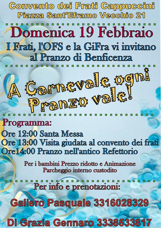 I FRATI, L'ORDINE FRANCESCANO SECOLARE E LA GIOVENTU' FRANCESCANA DEL CONVENTO DEI FRATI CAPPUCCINI DI SANT'EFRAMO, PIAZZA SANT'EFRAMO VECCHIO NAPOLI, ORGANIZZANO NELL'ANTICO REFETTORIO DEL CONVENTO UN PRANZO DI BENEFICENZA , CON PRELIBATEZZE E MENU' NELLA TRADIZIONE DEL CARNEVALE NAPOLETANO. LA GIORNATA INIZIA CON LA VISITA ALLE CATACOMBE E GIARDINO DEL CONVENTO E SARA' ALLIETATA DA MUSICA E CANZONI. PARCHEGGIO INTERNO. CONTATTARE: PASQUALE GALIERO AL N° 3316028329 PER INFO E PRENOTAZIONI.