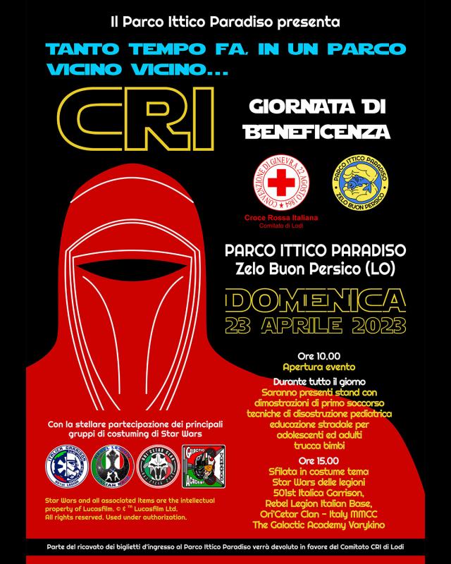 Domenica 23 Aprile al Parco Ittico Paradiso ci sarà un grande evento benefico a tema Star Wars, parte del biglietto d’ingresso sarà devoluto in favore della Croce Rossa italiana – Comitato di Lodi come ringraziamento per il costante impegno dei suoi volontari nel sostenere la comunità nei momenti di urgenza e supportare le persone in stato di vulnerabilità.