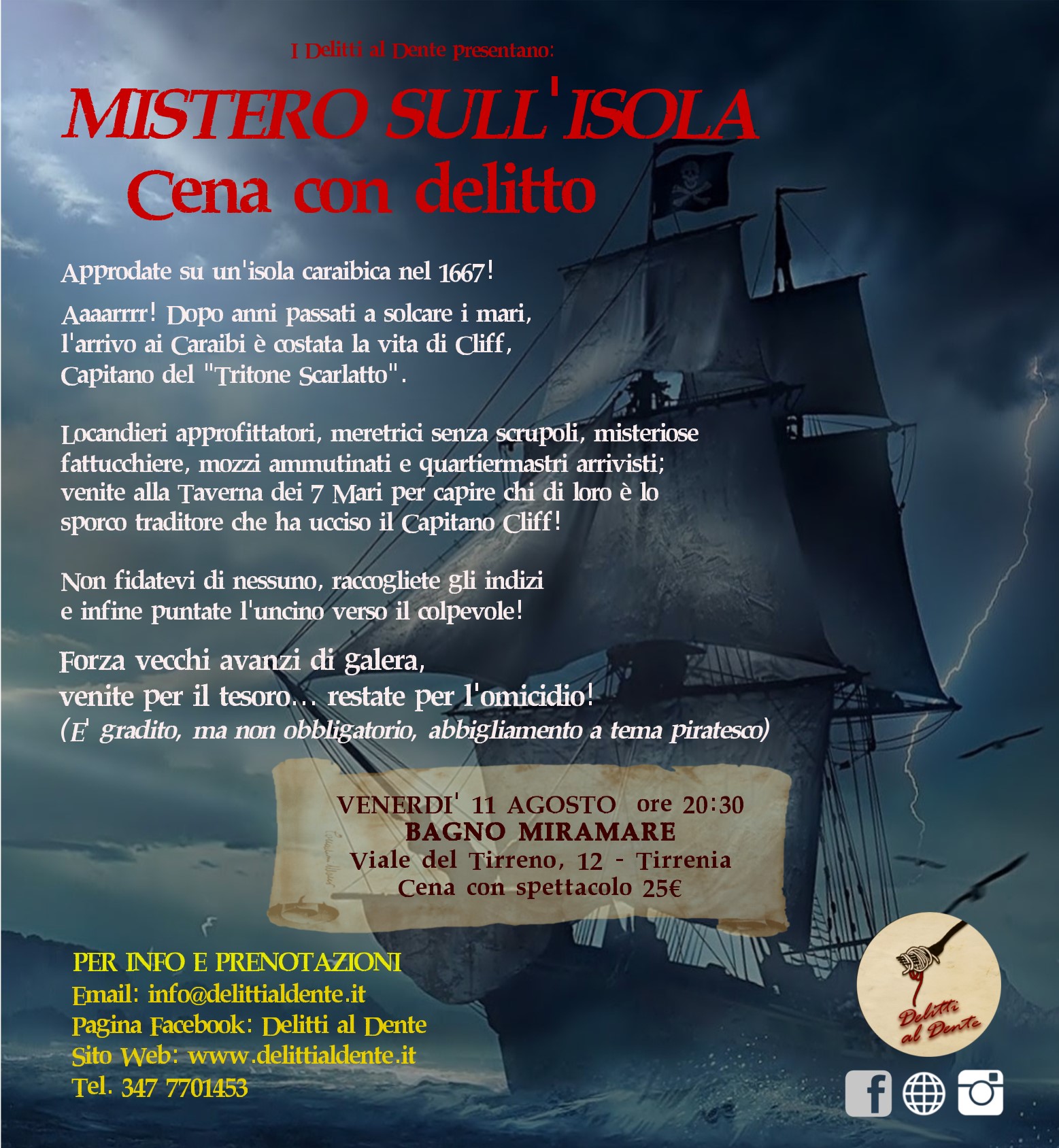 MISTERO SULL'ISOLACaraibi, 1667La Taverna dei Sette Mari è il teatro della misteriosa morte del Capitano Cliff.Chi prenderà adesso il timone del Tritone Scarlatto? Il Mozzo “Scafo” confabula con il Capitano in seconda John Martin; la Maitresse Eleine afferma che per Cliff provava solo amore; la Fattucchiera Malvina promette di non lasciare impunita la morte del fratello.E' consigliato (ma non obbligatorio) abbigliamento a tema piratesco!