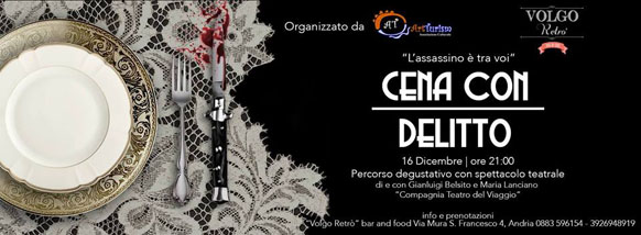 "Un venerdì in nero, la sera del 16 dicembre, al Volgo Retrò di Andria. Una commedia di genere poliziesco irrompe durante una cena. C’è un delitto di mezzo, forse più di uno. La padrona del ristorante dove la serata sta avendo luogo cerca di rassicurare i commensali ma una bufera ha bloccato tutte le uscite. La città è nel panico, così come gli ospiti all’interno, in balia dell’assassino che è proprio lì tra gli stessi commensali. E’ un gioco molto particolare questo. Perché gli avventori della serata sono invitati, forniti di copione-sceneggiatura, ad interpretare alcuni personaggi della storia, proprio i più sospettati. Ed è proprio tra loro che si nasconde l’assassino. La soluzione dell’enigma è demandata ai gruppi di investigazione corrispondenti alle stesse tavolate". Di e con gli attori Gianluigi Belsito e Maria Lanciano del Teatro del Viaggio e Murders Inn.