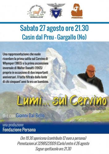 In scena, il giornalista-narratore Gianni Dal Bello, che ricorderà la salita sul Cervino di Edward Whymper (1865) e la prima ascensione invernale di Walter Bonatti (1965), forse il più grande alpinista italiano dello scorso secolo.