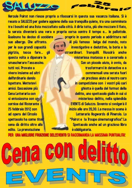 Events è un Ristorante unico nel suo genere ed è adatto in modo particolare per gestire serate a tema, celebrazioni, matrimoni, convention per formazione aziendale. Ambiente boho chic, aperto 365 giorni l’anno, dotato di un giardino esterno per il periodo estivo, capacità di ospitare 400 coperti, ampia scelta di catering convenzionati, fotografi, video-maker, musicisti, wedding planner. La Cena/Evento si si svolgerà il sabato 25 febbraio 2017, con inizio alle ore 20,30. Per una migliore fruizione dello spettacolo si raccomanda la massima puntualità. La messa in scena è ad opera del Circolo Letterario Hogwords di Pinerolo. Lo spettacolo ha come titolo "Poirot e la Troupe cinematografica". Un investigatore belga cerca di riposarsi in Italia nella quiete della provincia cuneese ma un omicidio nell’albergo che lo ospita attira la sua attenzione e lo costringe, controvoglia, ad interrompere i suoi agi. Quattro sospetti, due uomini e due donne, stimoleranno la sua materia grigia fino all’epilogo finale. I migliori 3 investigatori tra gli intervenuti riceveranno un grazioso attestato.