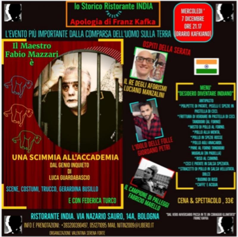 In concomitanza con i 140 anni dalla nascita di Kafka e i 100 anni dalla sua morte (1883 - 1924) lo storico Ristorante India, nel cuore di Bologna, sarà teatro di una inedita e innovativa cena con spettacolo realizzato e diretto dallo scrittore, regista Luca Guardabascio e la straordinaria partecipazione del Maestro Fabio Mazzari nel ruolo del protagonista, attorniato da prestigiosi ospiti come il "Re degli aforismi" Luciano Manzalini, "l'idolo delle Folle" Giordano Petri, il "Campione di palleggi" Fabrizio Maiello è l'attrice Federica Turco.