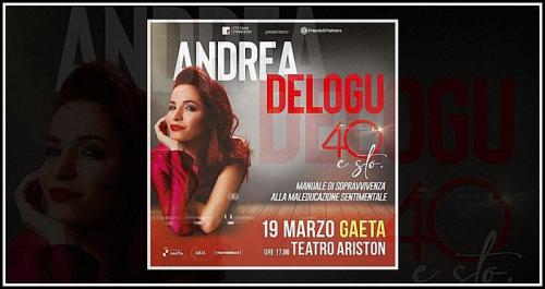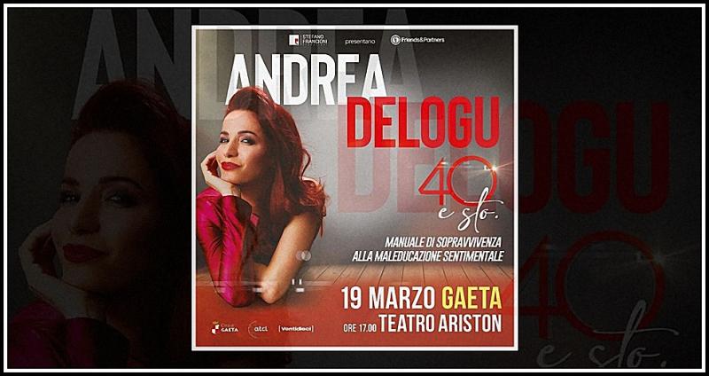 Andrea Delogu, il 19 marzo, al Teatro Ariston di Gaeta, con lo spettacolo “40 e sto”, Manuale di sopravvivenza alla maleducazione sentimentale, da un’idea di Andrea Delogu e Rossella Rizzi, scritto da Alberto Caviglia, Andrea Delogu, Rossella Rizzi e Giovanna Salvatori, regia di Enrico Zaccheo, data organizzata da Vincenzo Berti e Gianluca Bonanno per Ventidieci in collaborazione con ATCL Circuito multidisciplinare del Lazio . Produzione Stefano Francioni Produzioni e Friends & Partners, distribuzione Sava’ Produzioni Creative.