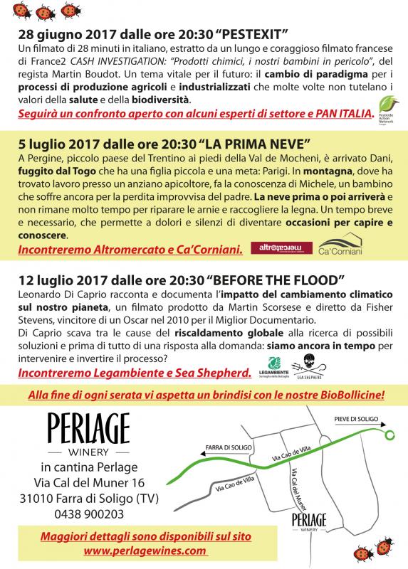 Il 28 giugno alle ore 20:30 si proietta “Pestexit”, un estratto di 28 minuti del lungo e coraggioso filmato di France2 Cash Investigation: “Prodotti chimici, i nostri bambini in pericolo”, del regista francese Martin Boudot. Interverrà Pan Italia, che ha curato la traduzione in lingua italiana, spiegando i motivi che si celano dietro questo documentario e le conseguenti reazioni del popolo francese. Perlage vuole prendere con questo filmato una posizione di difesa, e non di denuncia, nei confronti del proprio territorio, raccontando le pratiche positive in atto e i possibili futuri risvolti, mostrando che qualcosa di concreto è già in corso. Gli spunti saranno semplici, ma innovativi ed interverranno: Progetto Natura, a supporto tecnico dell’importanza di una viticoltura sempre più sostenibile; Antonio Basso, ricercatore dell’Università IUAV di Venezia presenterà il suo studio urbanistico del territorio, focalizzandosi sull’uso del suolo e l’evoluzione delle dinamiche sociali; mentre Marta Pederiva, a seguito della sua tesi basata sulla comunicazione della sostenibilità ambientale dell’area del Prosecco Superiore DOCG, presenterà delle idee su come portare efficacemente le iniziative di sostenibilità intraprese da istituzioni ed aziende all’attenzione del cittadino.