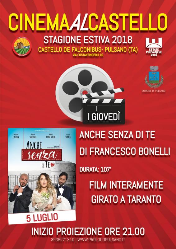I giardini del Castello De Falconibus sono ancora protagonisti della rassegna Cinematografica “Cinema al Castello” con la preziosa collaborazione del critico cinematografico Massimo Causo, giunta ormai alla sua quinta edizione, prenderà il via giovedì 5 luglio alle ore 21.00 con il film “Anche Senza Te” interamente girato a Taranto, diretto da Francesco Bonelli e distribuito dalla Sun Film Group di Taranto.