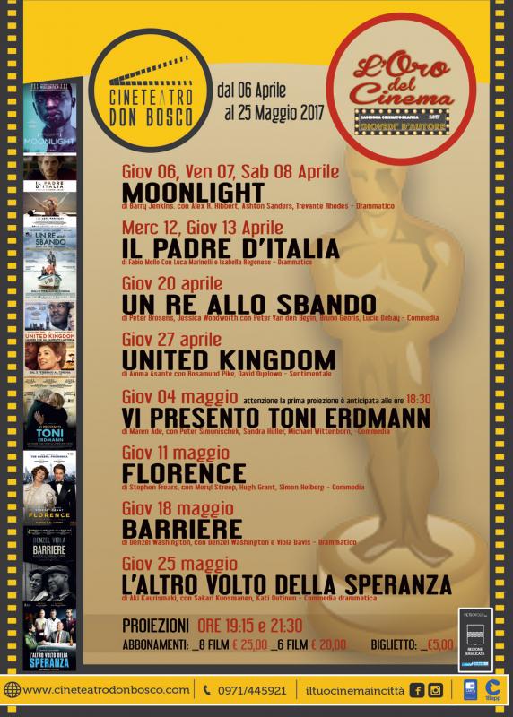 Parte Giovedì 6 Aprile 2017, presso il Cinema Don Bosco di Potenza, con proiezioni alle ore 19.15 e 21.30, la tradizionale rassegna cinematografica primaverile L’oro del cinema. L’iniziativa presenta i film premiati con i maggiori riconoscimenti dell’anno cinematografico, e le opere che hanno stupito, incuriosito, entusiasmato sia la critica che il pubblico.
