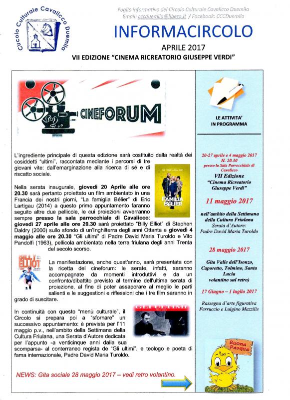 Per chi si “nutre” di cinema è in arrivo un piatto prelibato. E' prevista per giovedì 20 aprile p.v. alle ore 20.30 presso la sala parrocchiale di Cavalicco, infatti, l'inaugurazione della VII edizione della Manifestazione “Cinema Ricreatorio Giuseppe Verdi”, organizzata dal Circolo Culturale Cavalicco Duemila con il patrocinio del Comune di Tavagnacco.