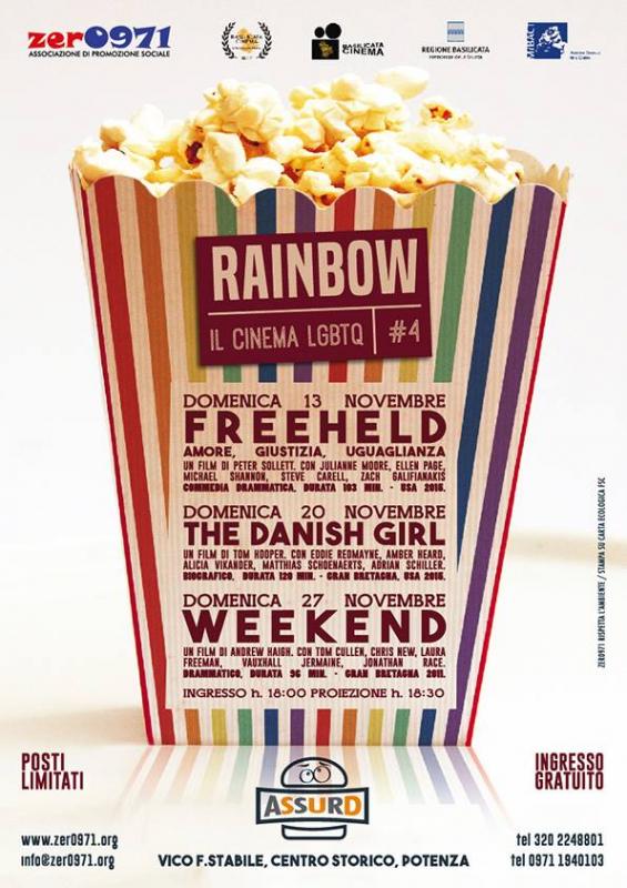 Nelle domenica 13, 20, 27 novembre 2016 a Pucceria Assurd, Via F. Stabile - Potenza, torna Rassegna Rainbow, 4^ Rassegna di cinema LGBT.