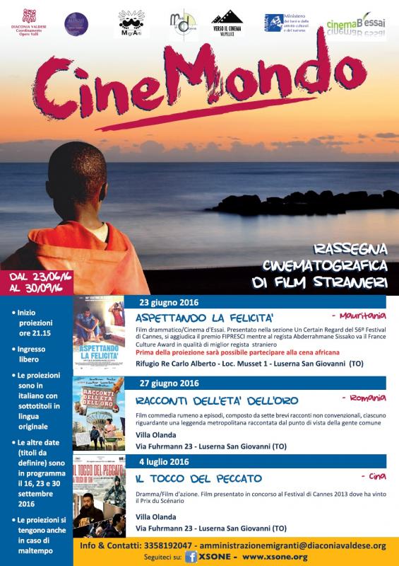 CINEMONDO, Progetto MigrArti-Cinema è la rassegna di film stranieri, espressione di comunità immigrate presenti in Italia, organizzata dal Servizio Richiedenti Asilo e Rifugiati della Diaconia Valdese - Coordinamento Opere Valli di Torre Pellice. Il progetto, realizzato con il contributo del Ministero dei Beni e delle Attività Culturali e del Turismo, Direzione Generale Cinema, Servizio II - Cinema e Audiovisivo, in collaborazione con le associazioni Un Mondo di Donne in Val Pellice e Cineforum B’Essai, ha quale obiettivo di favorire quanto più possibile la conoscenza delle culture dei nuovi italiani così da superare paure, diffidenze e pregiudizi. MigrArti, infatti, vuole creare le condizioni e le opportunità per far conoscere al meglio le culture di provenienza dei nuovi italiani con un'attenzione particolare alle seconde generazioni, autentico ponte tra i loro genitori e il futuro che li attende nel nostro Paese.