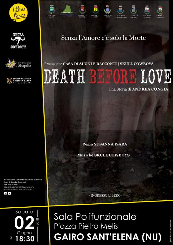 A due anni dall’inizio dei lavori del progetto cinematografico Death Before Love, la Casa di Suoni e Racconti e la band Skull Cowboys presentano il cortometraggio, frutto di una grande e articolata operazione artistica, organizzativa e di promozione del territorio ogliastrino e sardo più in generale. Sabato 2 Giugno 2018 alle ore 18:30 a Gairo Sant’Elena presso la Sala Polifunzionale (Piazza Pietro Melis) si terrà la prima presentazione pubblica del lavoro ideato nel 2016 dal musicista Andrea Congia, all’interno del percorso artistico della band progressive rock Skull Cowboys, prodotto da questi ultimi insieme all’Associazione Culturale Tra Parola e Musica - Casa di Suoni e Racconti.