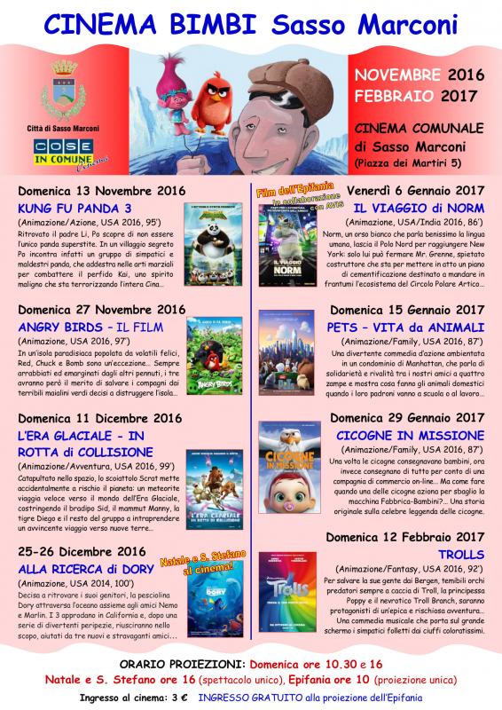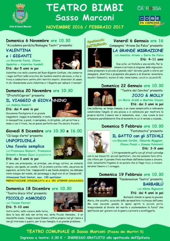 Parte a Sasso Marconi la stagione di cinema e teatro dedicata ai bambini: dal 6 novembre al 19 febbraio, ogni domenica al Cinema/Teatro comunale si alternano matinèe teatrali con divertenti storie e pièce ispirate a noti racconti per bambini, e proiezioni cinematografiche con i più recenti film di avventura e animazione. In tutto, si tratta di 8 film e altrettanti appuntamenti a teatro, adatti a bambini tra 4 e 10 anni.