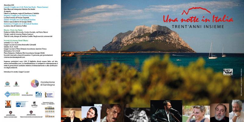 Il Festival del cinema di Tavolara “Una notte in Italia” fondato dai fratelli Marco e Augusto Navone con la direzione artistica di Piera Detassis (in collaborazione con Viviana Gandini, Claudia Panzica e Emanuele Degortes), si prepara a festeggiare la 30a edizione con una formula “speciale” che tiene conto dell’emergenza sanitaria ma non rinuncia a celebrare ancora una volta, in forma distanziata e contenuta, la bellezza dell’isola che ospita l’arena cinema più bella del mondo.