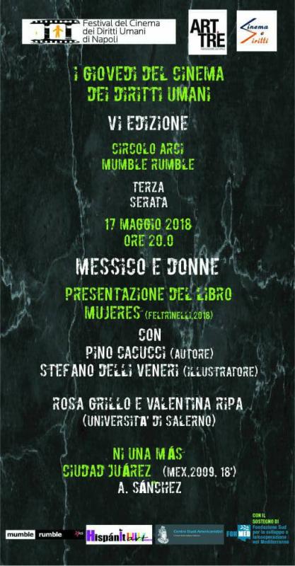 Ospiti lo scrittore Pino Cacucci e l’illustratore Stefano Delli Veneri che presenteranno il loro libro “Mujeres” (Feltrinelli, 2018), dedicato alle eroine rivoluzionarie di un Novecento ormai lontano. A intervistarli Valentina Ripa e Rosa Maria Grillo, professoresse di ispanistica e ispanoamericanistica all’Università di Salerno. A seguire la proiezione del cortometraggio di Alejandra Sánchez che documenta la scomparsa e il successivo ritrovamento del corpo di Alejandra Lilia Andrade, una delle tantissime giovani donne vittime di femminicidio a Ciudad Juárez, una cittadina messicana al confine con gli Stati Uniti.