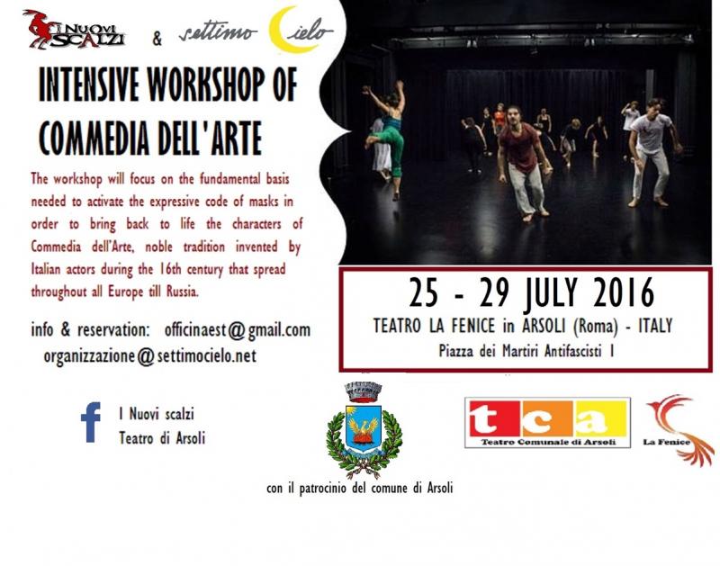 Dopo la positiva esperienza del progetto di Residenza Il teatro comico, che si è svolto dal 15 al 31 marzo 2016, continua la collaborazione tra l'Associazione Settimo Cielo ed I Nuovi Scalzi. Questi ultimi saranno ancora ospiti al Teatro Comunale La Fenice di Arsoli con MASCHERE E CARATTERI DELLA COMMEDIA DELL’ARTE, un laboratorio di Commedia dell'Arte che si concentrerà sulla base fondamentale necessaria per attivare il codice espressivo delle maschere, al fine di riportare in vita i personaggi della Commedia dell'Arte, nobile tradizione inventata dagli attori italiani nel corso del 16 ° secolo che si diffuse in tutta Europa fino in Russia.