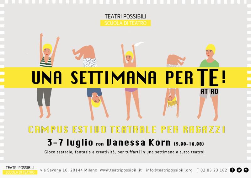 Una settimana estiva piena di avventura ed allegria a Teatri Possibili, nelle sue luminose aule fresche, in cui sarete guidati da Vanessa Korn attraverso l'improvvisazione, la recitazione, i giochi teatrali e la visione di grandi film o spettacoli teatrali dei grandi registi da cui rubare ispirazioni!