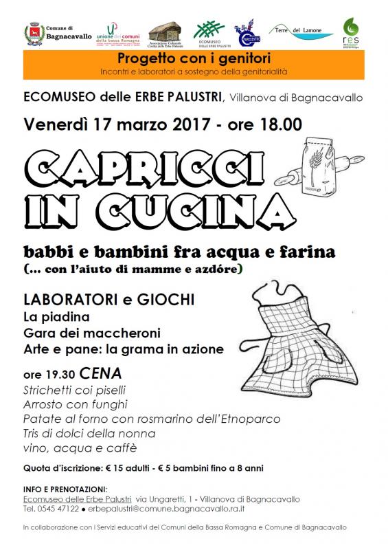 Venerdì 17 marzo, in concomitanza con la Festa del Papà, all’Ecomuseo delle Erbe Palustri di Villanova di Bagnacavallo, ritorna l'appuntamento con Capricci in cucina. A partire dalle ore 18.00 babbi e bambini, aiutati da mamme e azdóre, si divertiranno insieme con acqua e farina, giocando e sperimentando laboratori per fare la piadina, impastando con l'antica grama e creando forme tradizionali o di fantasia con la pasta del pane.