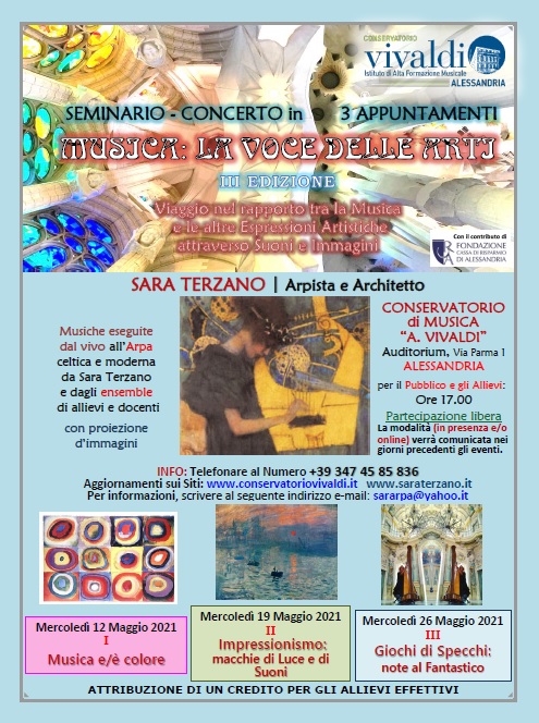 Con la Terza edizione del Seminario-concerto “Musica – La Voce delle Arti” prosegue l’avvincente viaggio alla ricerca del dialogo tra la Musica e le varie forme delle espressioni artistiche nei diversi secoli; questo appassionante percorso nella Musica, nell’Arte e nell’Architettura è realizzato da Sara Terzano, docente titolare della Cattedra di Arpa del Conservatorio di Musica “A. Vivaldi di Alessandria” ed è in scena proprio nell’Auditorium del Conservatorio di Alessandria. L’evento è realizzato con il Contributo della Fondazione Cassa di Risparmio di Alessandria.