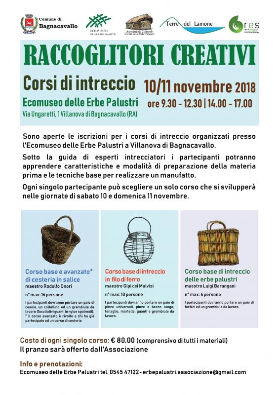 Sono aperte le iscrizioni per i corsi di intreccio “Raccoglitori creativi” che si terranno nelle giornate di sabato 10 e domenica 11 novembre 2018, presso l'Ecomuseo delle Erbe Palustri di Villanova di Bagnacavallo. I corsi sono rivolti a principianti e intrecciatori di livello avanzato, finalizzati a tramandare antiche tecniche e un utilizzo sostenibile delle risorse naturali. Nelle due giornate prenderanno vita diverse tecniche di intreccio sotto la guida di abili maestri: corso base e avanzato di cesteria con l'intreccio di salice e canna condotto dal maestro ciociaro Rodolfo Onori; corso base sull’utilizzo e intreccio dell’erba di valle condotto dal maestro romagnolo Luigi Barangani, responsabile del “Cantiere Aperto” dell’Ecomuseo; corso di intreccio in fil di ferro con il maestro Gipi dei Malvisi.