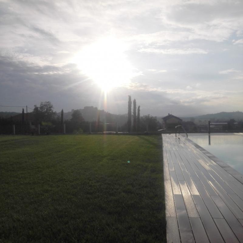 Un prato a bordo piscina, il sole che tramonta dietro il castello di Frinco, il cielo che si tinge di rosso e intorno solo i rumori della natura. La cornice ideale per rilassarsi e fare meditazione Yoga guidati da Marina Demaria.