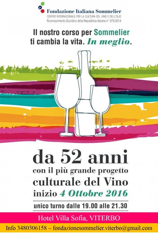 Il 4 Ottobre avrà inizio presso l’elegante location dell’Hotel Villa Sofia il Corso di Qualificazione Professionale per Sommelier, organizzato dalla Delegazione di Viterbo della “Fondazione Italiana Sommelier”.