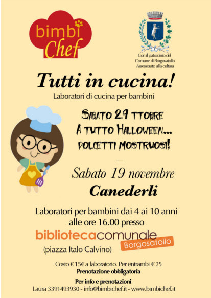 Come superare la paura di Halloween? Ma con un bel laboratorio di cucina! Prepareremo insieme deliziosi mostri che, non solo non spaventeranno nessuno, ma soprattutto saranno divertenti e buonissimi da mangiare! Il laboratorio è adatto a bambini dai 4 ai 10 anni. Prenotazione obbligatoria. Costo laboratorio € 15, oppure € 25 con la data del 19 novembre