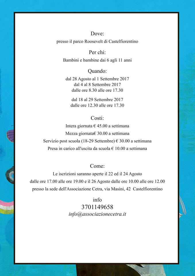 Da lunedì 18 a venerdì 29 settembre, le attività si svolgeranno in orario post scolastico, con la possibilità di presa in carico presso la scuola da parte del personale di Cetra.