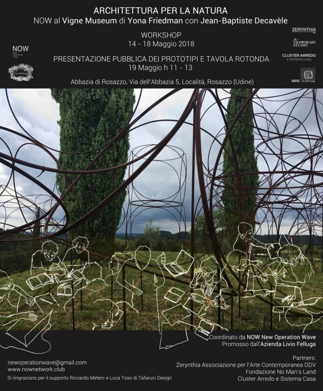 Primo progetto di formazione ospitato dal Vigne Museum, la NOW Summer School presenterà il 19 maggio prossimo i risultati dei tre progetti di residenza intitolati "Architettura per la Natura” che da settembre 2017 scandiscono le attività ispirate all’installazione permanente firmata da Yona Friedman con Jean-Baptiste Decavèle, creata nel 2014 per celebrare i 100 anni del fondatore Livio Felluga.