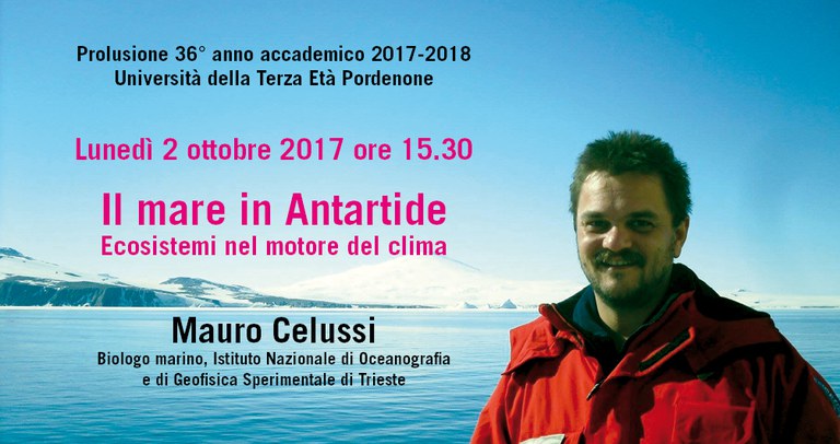 PORDENONE - Si apre lunedì 2 ottobre, alle 15.30 nell’Audiitorium del Centro Culturale Casa Zanussi di Pordenone, il 36° Anno Accademico dell’UTE – Università della Terza Età di Pordenone. La nuova stagione di corsi, studi e approfondimenti debutta nel segno di un tema di stretta attualità scientifica, affidato al biologo marino Mauro Celussi: la lezione su “Il mare in Antartide. Ecosistemi nel motore del clima” focalizzerà l’attenzione intorno ai microorganismi del plancton, che rivestono un ruolo fondamentale nella regolazione dei flussi di carbonio fra l’atmosfera, il mare superficiale, il mare profondo ed il ghiaccio marino, quindi nella regolazione delle condizioni generali di vita e clima sulla terra.