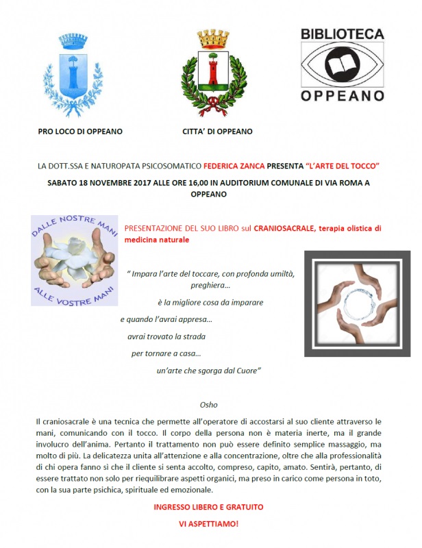 Comune di Oppeano, in collaborazione con Pro Loco e Biblioteca civica di Oppeano, promuove un incontro informativo e legato alla salute: sabato 18 novembre 2017 alle ore 16,00 in auditorium comunale “Don Remo Castegini” di via Roma a Oppeano la dott.ssa Federica Zanca presenta “L’arte del tocco”.