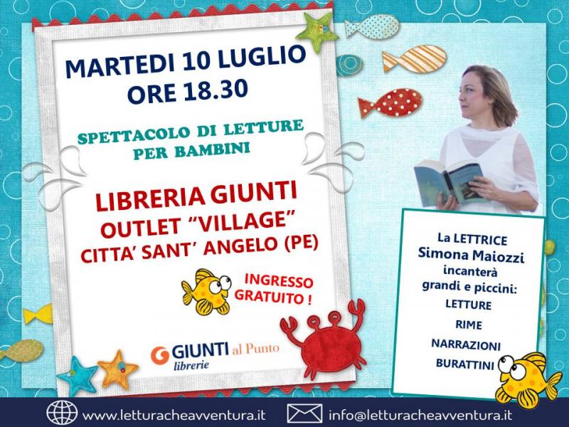 La lettrice Simona Maiozzi svolgerà il suo spettacolo di letture per bambini da 3 a 10 anni finalizzato a far amare i libri e la lettura fin da piccoli nella Libreria Giunti all'interno del Village Outlet MARTEDI 10 LUGLIO ORE 18.30 INGRESSO GRATUITO dopo 5 presenze (5 bollini sulla tessera) avrai un LIBRO IN REGALO! La tessera è gratuita la puoi ritirare il giorno stesso!