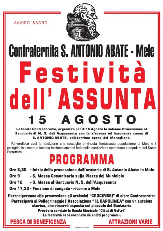 La Confraternita organizza per il 15 Agosto la solenne processione al Santuario di N. S. dell’Acquasanta con la sfarzosa ed imponente cassa di SANT’ANTONIO ABATE, celeberrima opera del Maragliano recentemente restaurata.