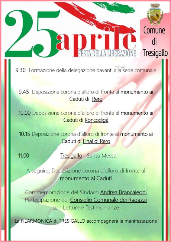 25 Aprile 2018, 73° Anniversario della Liberazione, il Comune di Tresigallo invita ai tradizionali eventi celebrativi: