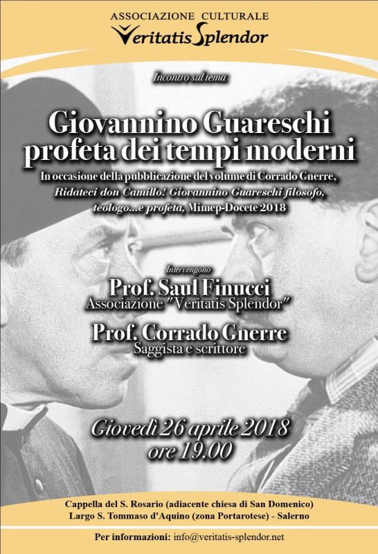 L’Associazione Culturale “Veritatis Splendor” ha organizzato a Salerno per giovedì 26 aprile, alle ore 19, presso la cappella del SS. Rosario (adiacente la chiesa di S. Domenico), in Largo S. Tommaso d’Aquino, un incontro sul tema: “Giovannino Guareschi profeta dei tempi moderni”. A presentare la figura del noto inventore di Don Camillo e Peppone, saranno il Prof. Saul Finucci e il Prof. Corrado Gnerre, saggista e scrittore, autore del recente volume Ridateci don Camillo! Giovannino Guareschi filosofo, teologo…e profeta (Mimep-docete, 2018), che verrà presentato nel corso della serata. L’evento si inserisce nell’ambito delle celebrazioni per il cinquantesimo anniversario della morte del grande scrittore italiano.