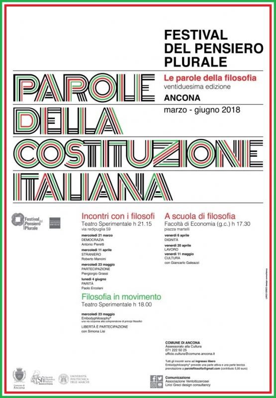 Quest’anno, il Festival del Pensiero Plurale ha voluto mettere a tema alcune parole della Costituzione italiana, varata giusto 70 anni or sono. Così negli Incontri con i filosofi e nella Scuola di filosofia si parlerà della Costituzione repubblicana riguardata specificamente dal punto di vista filosofico. Le parole Democrazia, Straniero, Partecipazione e Parità saranno trattate al Teatro Sperimentale, e le parole Dignità, Lavoro e Cultura, alla Facoltà di Economia. Con ciò si vogliono evidenziare alcuni aspetti considerati nevralgici della Carta costituzionale con l’intento di misurarsi con la Costituzione repubblicana non meno che di commisurarla al nostro tempo.