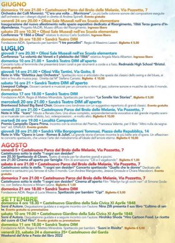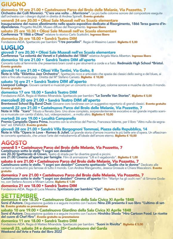 sabato 6 ore 21.00 • Castelnuovo Parco del Brolo delle Melanie, Via Pozzetto, 7 Castelnuovo sotto le stelle. "I sogni son desideri" Concerto spettacolo "Quello che le donne" Dedicato alle cantanti e cantautrici più famose di tutto il mondo. Con Andrea Manganotto, Jessica Grossule e Chiara Mascalzoni. Evento gratuito domenica 7 ore 21.00 • Castelnuovo Parco del Brolo delle Melanie, Via Pozzetto, 7 Castelnuovo sotto le stelle "I sogni son desideri" Cinema all'aperto Film "Marilyn ha gli occhi neri" di Simone Goda-no, con Stefano Accorsi e Miriam Leone. Biglietto € 1,00