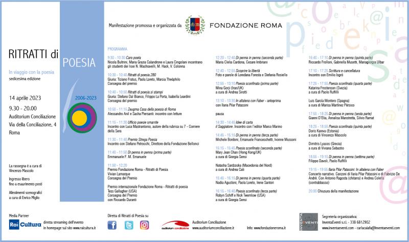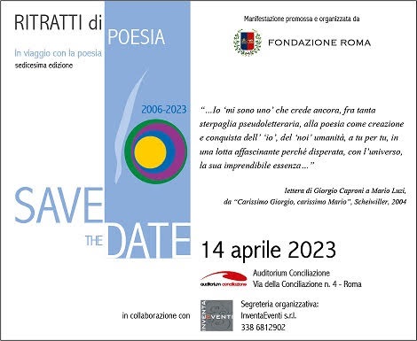 La XVI edizione di Ritratti di poesia, promossa e organizzata dalla Fondazione Roma in collaborazione con InventaEventi S.r.l, si terra` a Roma, all’Auditorium Conciliazione, il 14 aprile 2023. La manifestazione, nata nel 2006 da un’intuizione e per volontà dell’allora Presidente della Fondazione Roma, Prof. Avv. Emmanuele Francesco Maria Emanuele, oggi Presidente Onorario, vedrà sul palco più di 30 poeti da tutto il mondo e 24 incontri.