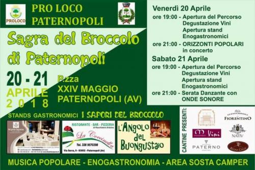 Appuntamento con la tradizione e la cucina tipica a Paternopoli, in provincia di Avellino, dove venerdì 20 e sabato 21 aprile 2018 si terrà una nuova edizione della "Sagra del Broccolo di Paternopoli", la kermesse gastronomica organizzata dalla locale Pro Loco che celebra uno dei prodotti di questa terra che, dal 2012, è uno dei presidi Slow Food.
