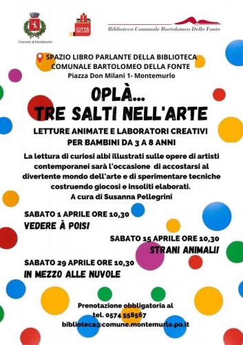Alla biblioteca “Bartolomeo Della Fonte” (piazza Don Milani, 1- Montemurlo) inizia un nuovo ciclo di letture animate dedicate ai bambini dai 3 agli 8 anni, dal titolo “Olpà… tre salti nell'arte” a cura di Sara Pellegrini.