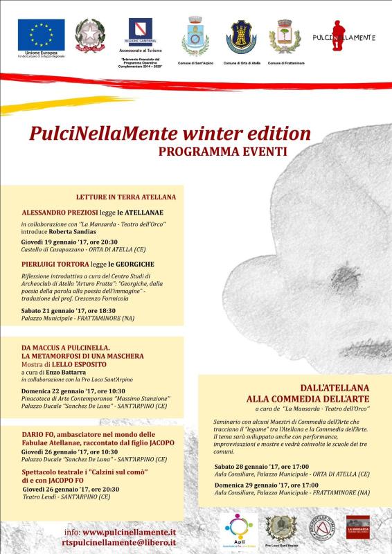 Si è certi che il seminario contribuirà ulteriormente al successo della winter edition di PulciNellaMente, ideata da Elpidio Iorio e realizzata grazie all’impegno costante dei sindaci dei tre Comuni atellani impegnati nella rassegna: Giuseppe Dell’Aversana per Sant’Arpino, Giuseppe Mozzillo per Orta di Atella e Giuseppe Bencivenga per Frattaminore. Il progetto è finanziato dalla Regione Campania con i fondi del Programma Operativo Complementare (POC) 2014-2020 – Linea Strategica 2.4 “Rigenerazione Urbana, Politiche Per Il Turismo e Cultura”.