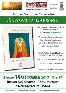 Il Circolo Culturale l’Alba, con il patrocinio non oneroso della Pro Loco e del Comune di Fagnano Olona, Vi invitano alla presentazione del romanzo “L’amore rincorso” dell’autrice Antonella Garzonio che si terrà sabato 14 Ottobre2017 alle ore 17 presso la Biblioteca comunale in Piazza Matteotti a Fagnano Olona.