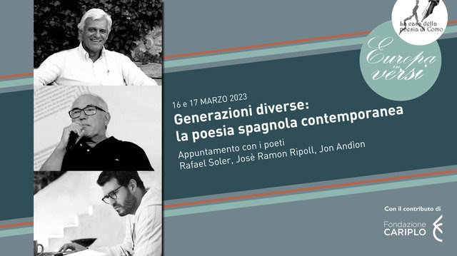 Nell’ambito degli eventi organizzati da La Casa della Poesia di Como in preparazione della 13° edizione del Festival Internazionale di Poesia “Europa in versi” che si terrà a maggio, uno speciale incontro con tre poeti, tra i più significativi della poesia spagnola contemporanea: Rafael Soler, José Ramón Ripoll, Jon Andión.