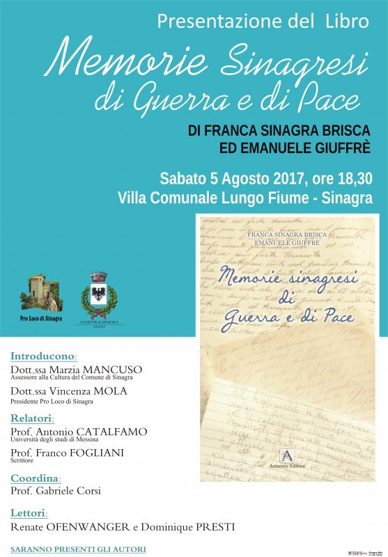 La Pro loco di Sinagra in collaborazione con il Comune di Sinagra Sabato 5 agosto 2017 alle ore 18,30 nella Villa Comunale Lungo Fiume, presenta il libro “Memorie Sinagresi di Guerra e di Pace” di Franca Sinagra Brisca e Emanuele Giuffrè, edito da Armenio Editori.