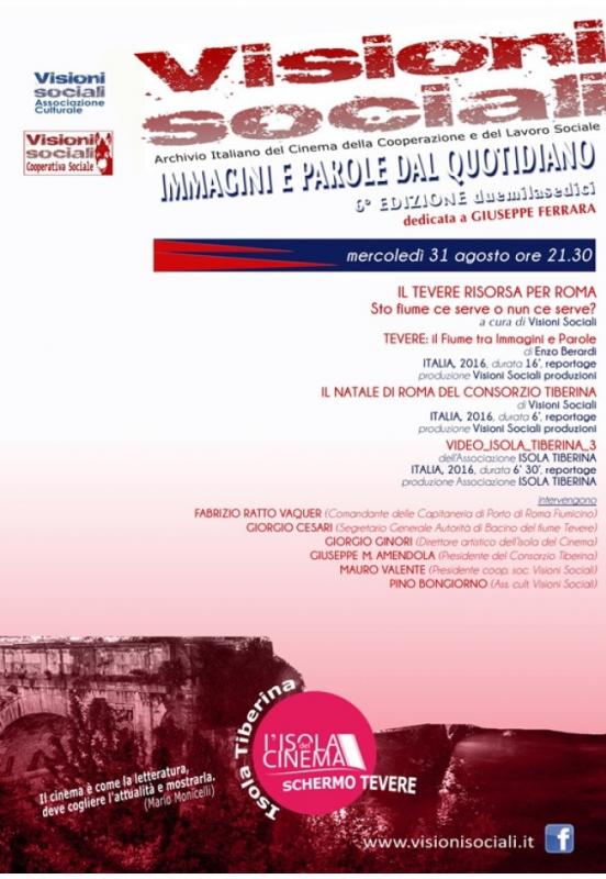 Mercoledì 31 agosto alle 21,30, ultimo appuntamento, nello spazio “Schermo Tevere”, con la sesta edizione della rassegna “immagini e Parole dal Quotidiano” organizzata da Visioni Sociali nell’ambito della manifestazione “L’isola del Cinema”. “Il Tevere risorsa per Roma: sto fiume ce serve o nun ce serve” il titolo dell’incontro.