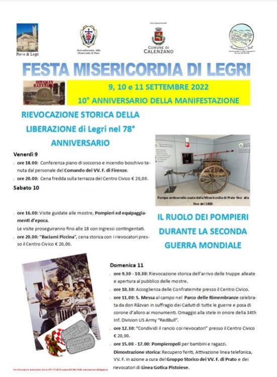 La Misericordia di Legri invita tutti a partecipare alla Festa che si terrà venerdì 9, sabato 10 e domenica 11 settembre 2022. Con la collaborazione della Linea Gotica Pistoiese, con il Comando dei VV. F. di Firenze e con il Gruppo Storico dei VV. F. di Prato, la Misericordia di Legri intende dare continuità all’evento della Liberazione nel suo 78° anniversario, mettendo in luce la grande importanza del ruolo avuto dai pompieri nel periodo bellico.