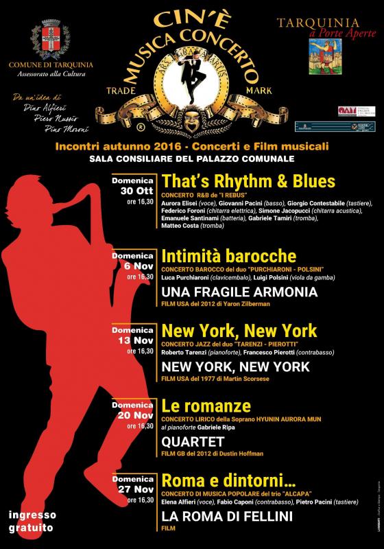Concerti e proiezioni d’autunno nella sala consiliare del palazzo comunale dal 30 ottobre, ogni domenica, alle ore 16,30 (ingresso libero). Tarquinia si sa è una fucina di talenti musicali e ogni anno questa manifestazione si ripete presentando alla ribalta i giovani più promettenti e talentuosi. Inoltre fanno sempre parte degli incontri artisti affermati di adozione, quest’anno Luca Purchiaroni e Hyunin Aurora Mun, bande e gruppi musicali e ospiti eccellenti, come Leandro Piccioni, Luigi Polsini, Sandro Pippa (tarquiniesi) o musicisti di livello internazionale come Mario Tronco, Marta Capponi, Giovanni Benvenuti, Roberto Tarenzi.
